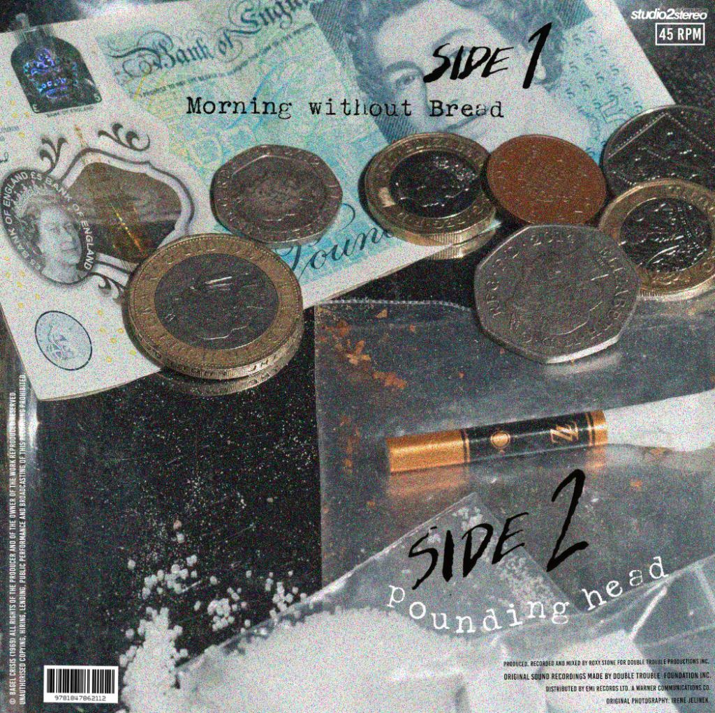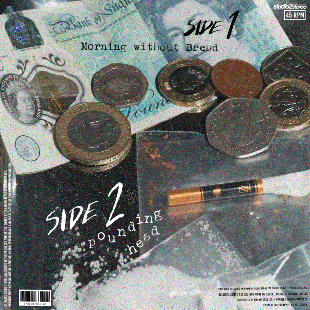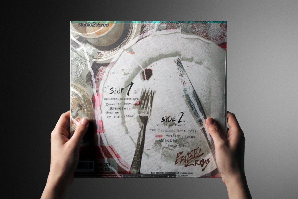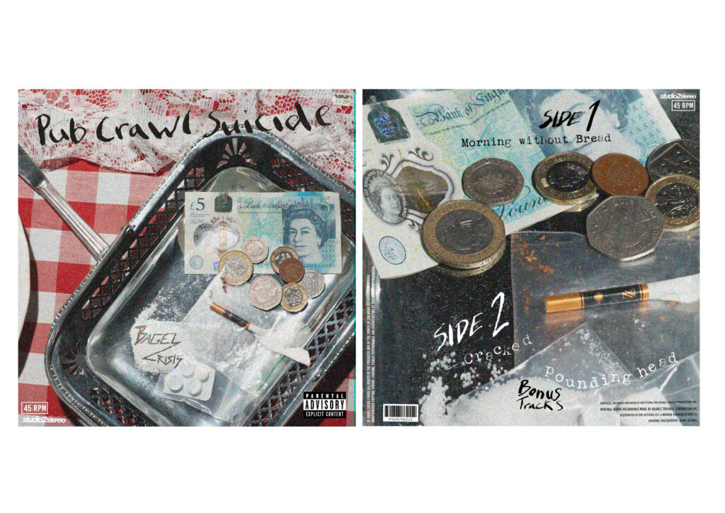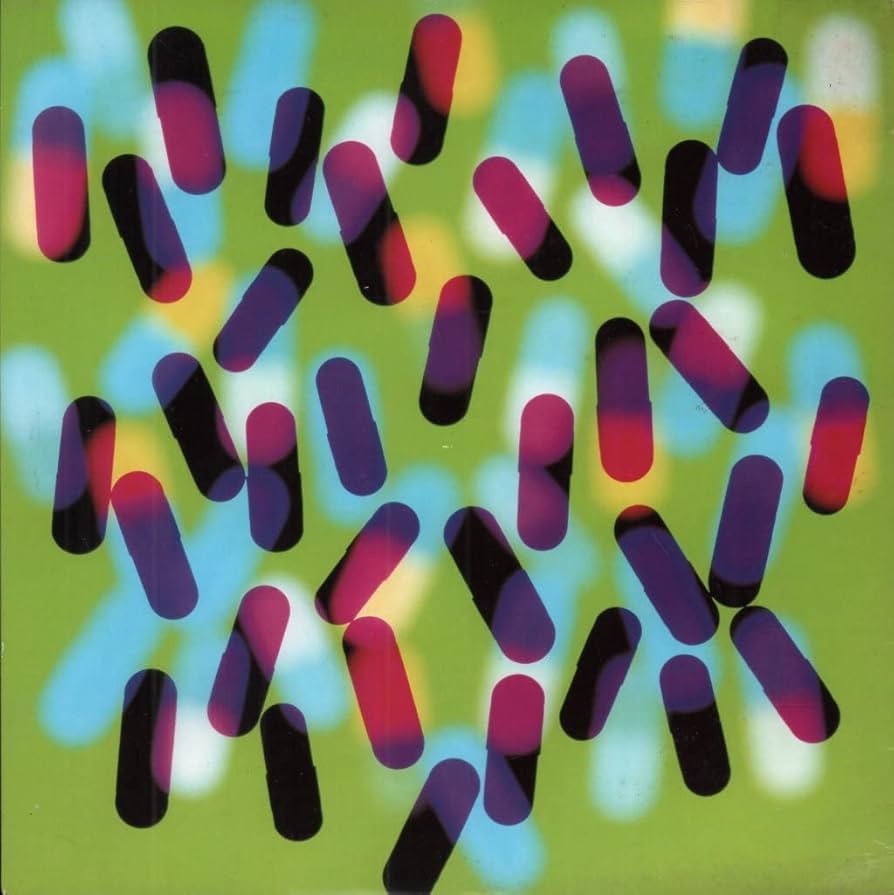 This cover is from Fine time, capturing the spirit of drug-fuelled club nights of 1988, heavily influencing the album, with pharmaceuticals appearing with different patterns across across each format. For my band I want the imagery to be of their night out fuelling them with the night pub crawls, with the aftermath of the next few hours will the morning to try capture that energy.