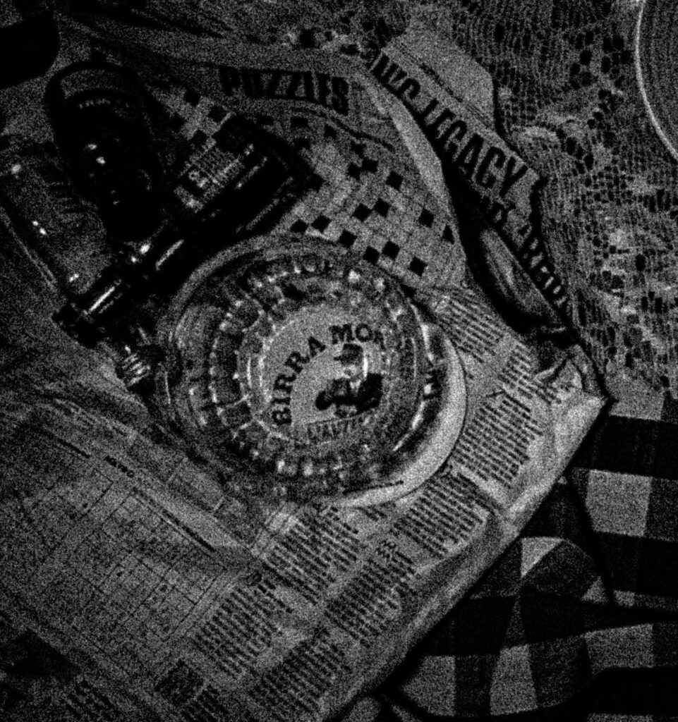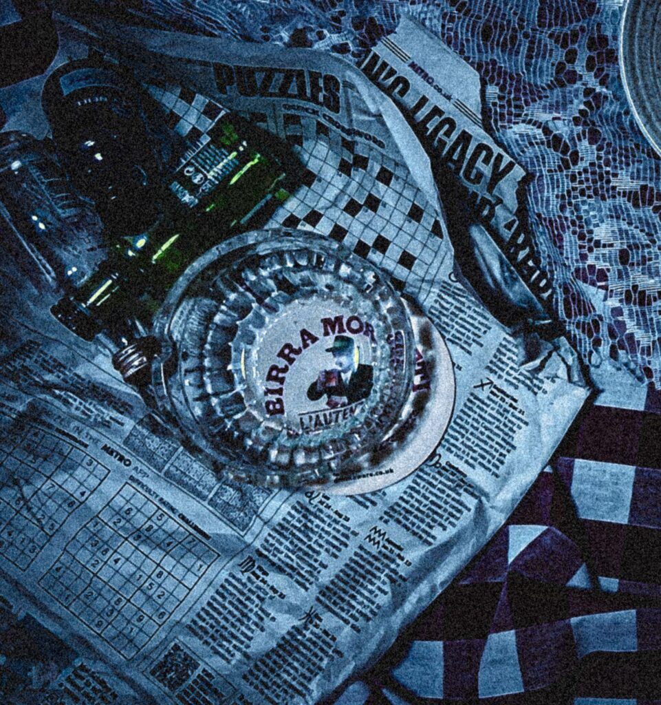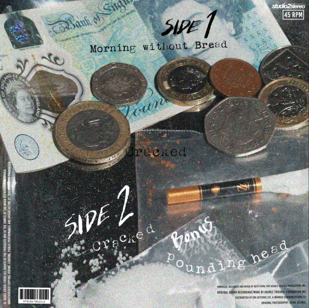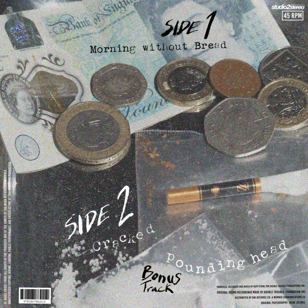 This cover is from Fine time, capturing the spirit of drug-fuelled club nights of 1988, heavily influencing the album, with pharmaceuticals appearing with different patterns across across each format. For my band I want the imagery to be of their night out fuelling them with the night pub crawls, with the aftermath of the next few hours will the morning to try capture that energy.