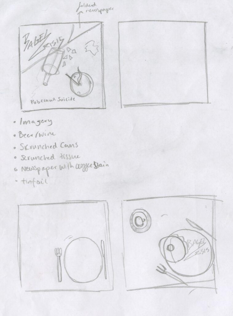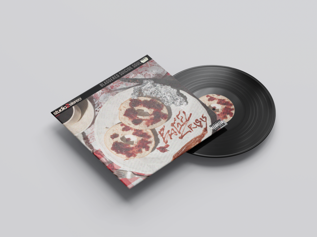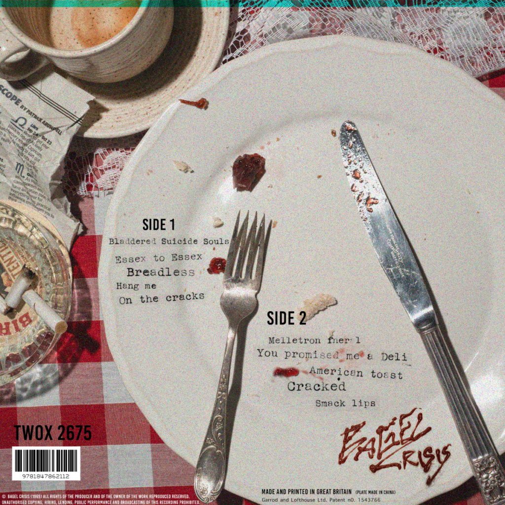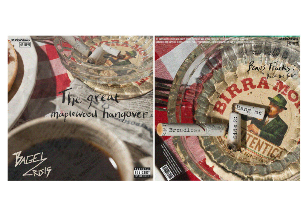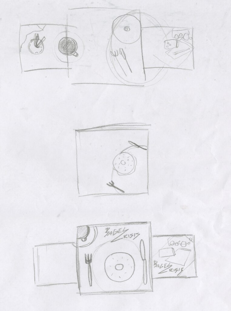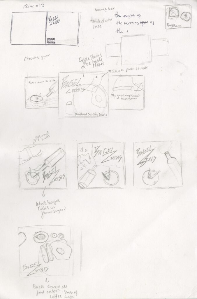 I was unsure about the placement of text, as I had quite a lot of empty space, I hadn’t added the logo as I was going to have it on the back instead of the front, but it worked a lot better when the band name was on the front. I decided to be quite obvious and have the bagel imagery for the LP.