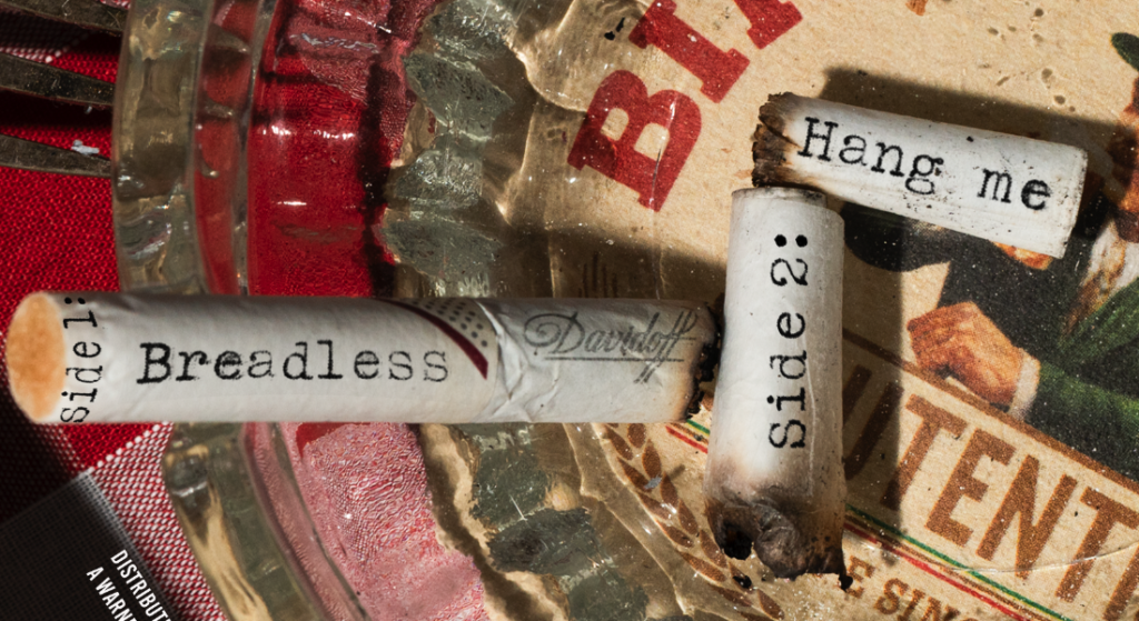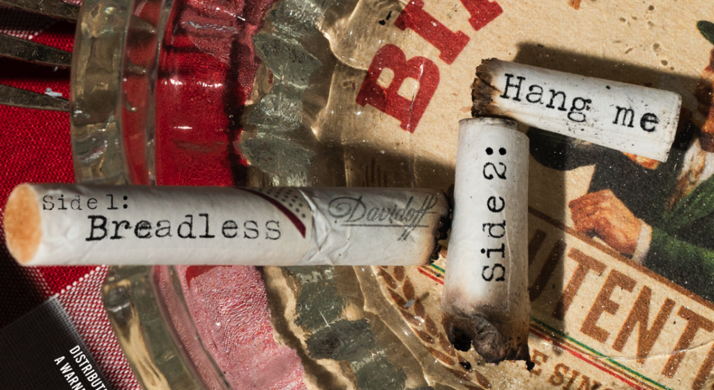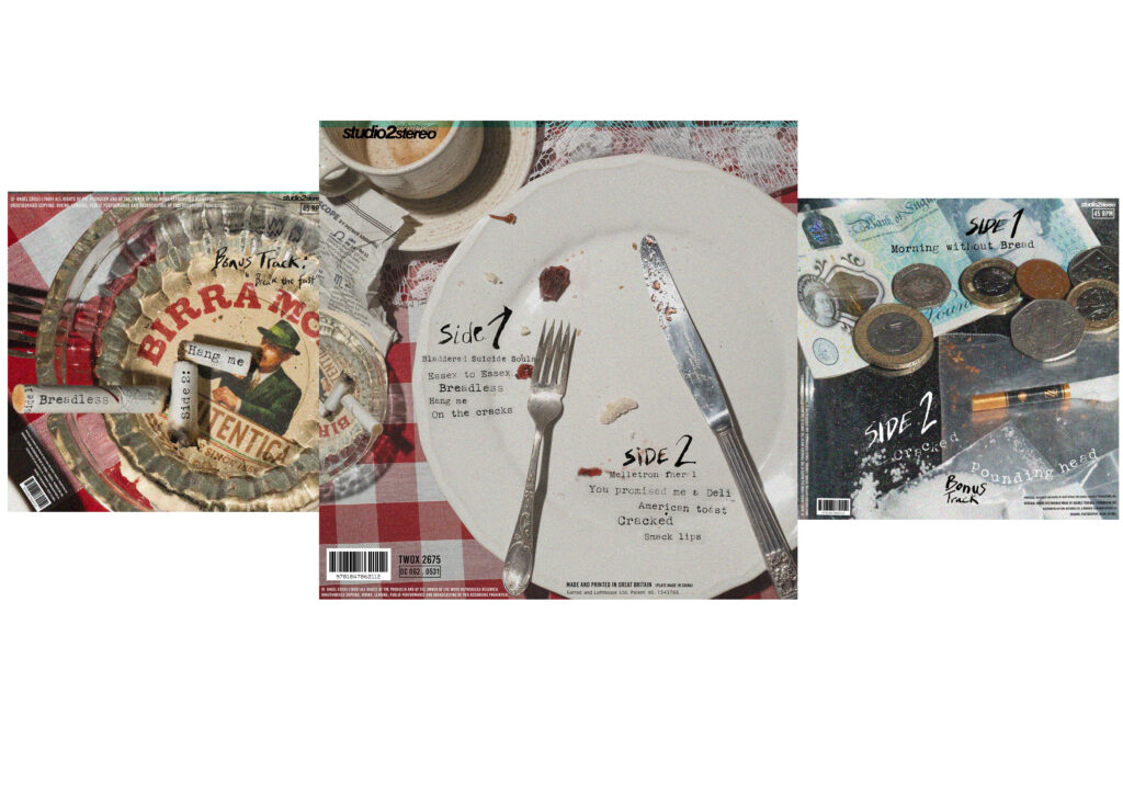 I struggled when I was making them, as I wanted to give them more of a punk feel, but the photographs I took were quite strong and part of my 3D element and just arranging them around to find the right placement of them. Originally, from my thumbnails I was going to have a birds eye view and crop them, so they all run across as one image with the LP in the middle and the two singles on both sides. I took some closer shot ones, which were much stronger in composition so those are the images I went with.