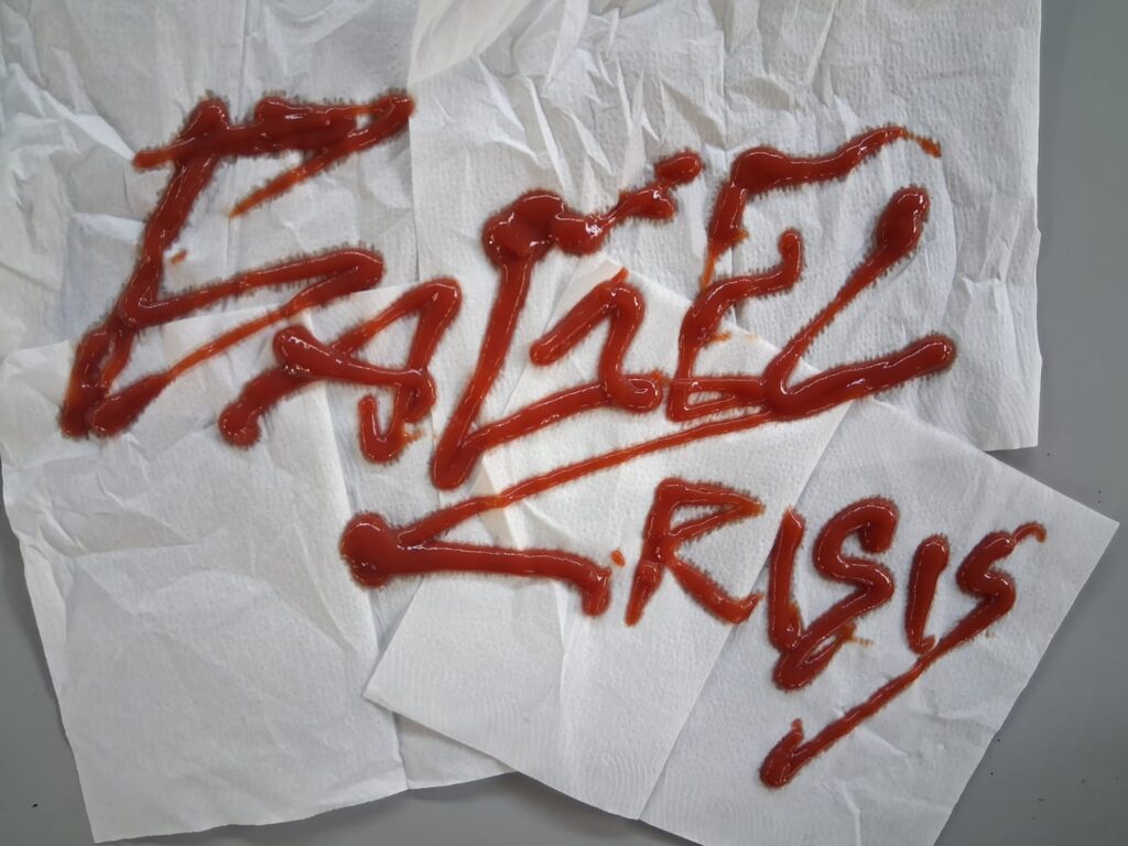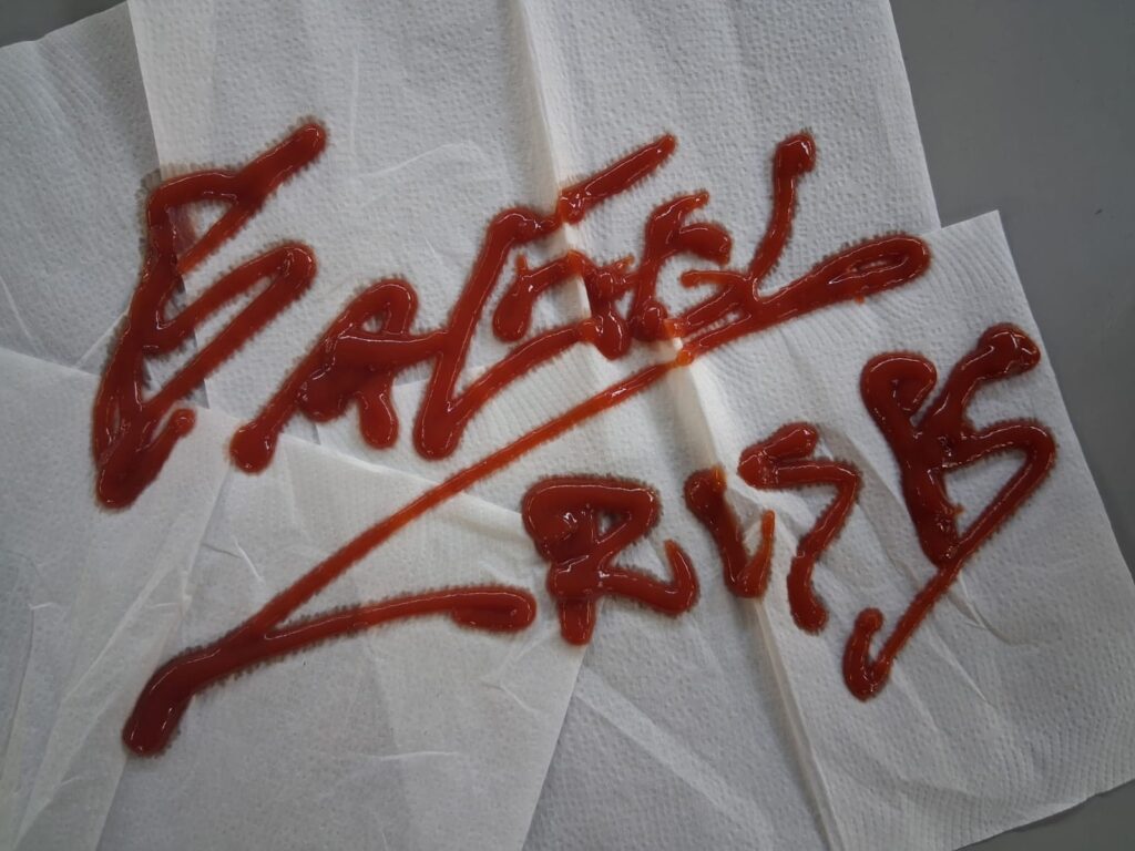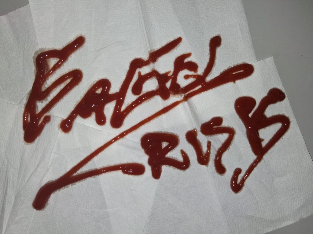 Since I did not do it on the shoot, I ended up adding/making the logo/band name from ketchup as closely I could to the logo to match with the theme on food which I was going for. I did two separate ones. It was easier writing in ketchup that I thought it would.